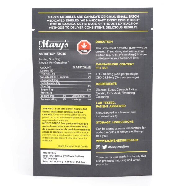 1000mg THC Indica Gummy Bar by Mary’s Edibles is a 1 piece gummy bar that can be easily divided into four 250mg portions. This treat is very potent and should be eaten in small portions to determine your tolerance level.
