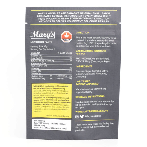 1000mg THC Sativa Gummy Bar by Mary’s Edibles is a 1 piece gummy bar that can be easily divided into four 250mg portions. This treat is very potent and should be eaten in small portions to determine your tolerance level.