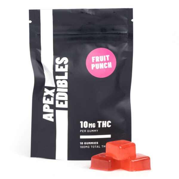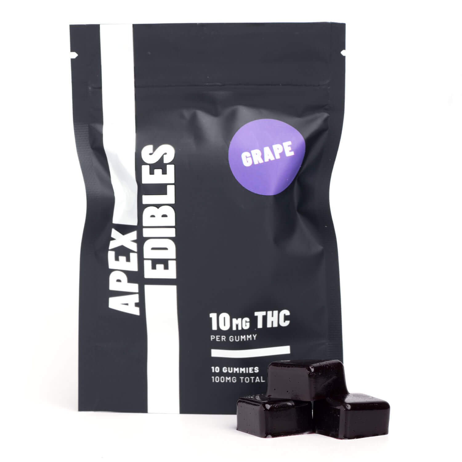 Apex Edibles come in 10 piece bags with 10mg THC per gummy for a total of 100mg THC per package.