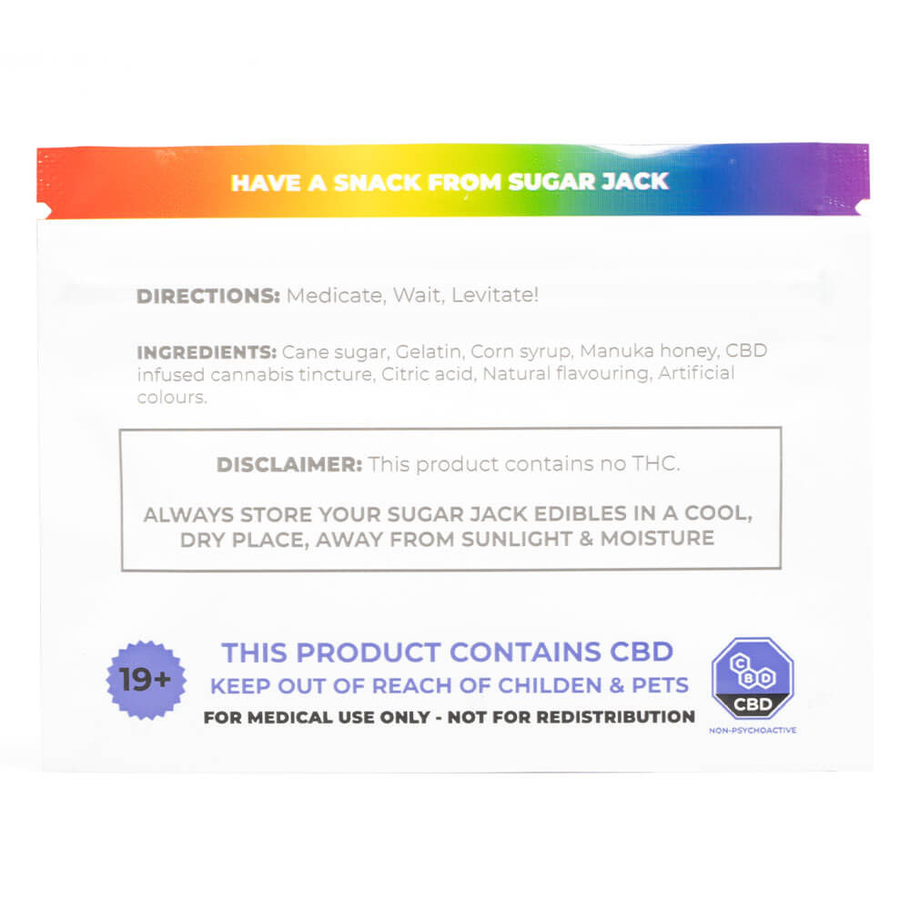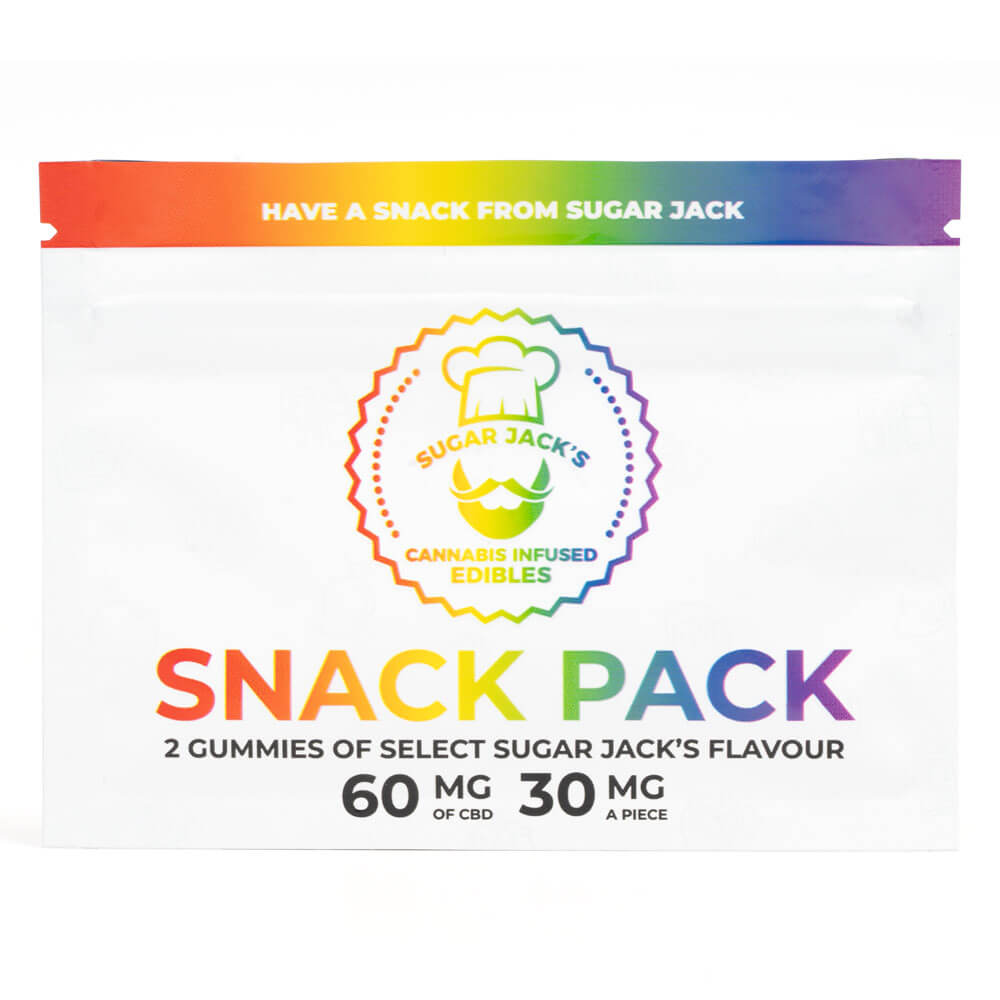 60mg CBD Snack Pack contains 2 gummies of select sugar jacks flavours, making it the perfect on the go edible snack. Sugar Jacks Gummies are made with all natural flavours & colours. They are handcrafted, infused with premium distillate extract during the cooking process and coated with sugar for extra deliciousness. Our refreshing Variety Pack Gummies are sweet, juicy & incredibly tasty! Ingredients: Cane Sugar, Gelatin Corn Syrup, Manuka Honey, CBD infused tincture, Natural Flavoring, Artificial colours Sugar Jacks’ uses natural cane sugar and Manuka honey sourced directly from New Zealand. Natural cane sugar gives Sugar Jack’s Assorted Gummies its signature, fun gummy chew while also providing a fuller-bodied taste compared to processed sugars. To give Sugar Jack’s Assorted Gummies their medicated kick, Sugar Jacks’ create their cannabis infusions from scratch in-house and without the use of any fillers or diluents. Their pure extract is tested at 95% and is nano-emulsified using a proprietary process to increase its solubility. This guarantees a precise dose and accurate each time. After that, each batch is also run through several quality control tests to ensure their potency and quality before they’re packaged and delivered!THC edibles offer a convenient, discreet, and healthy way to medicate with cannabis. They cause no lung irritation, and they offer a measurable and accurate dose of THC. Unlike smoking or vaping flower or cannabis concentrates, weed edibles work in a vastly different way. Instead of being absorbed by our blood, THC edibles travel through the gastrointestinal tract and is broken down before the cannabinoids are transported to our liver. Once they’re in the liver, the THC within THC edibles is transformed into 11-OH-THC, also known as 11-hydroxy-metabolite. This transformation is why edibles are a lot stronger than the smoking of regular marijuana flower. 11-OH-THC is more potent than regular THC and is metabolized by our bodies a lot slower, producing a more potent and longer-lasting effect. When it comes to dosing THC edibles, there is no “one-size-fits-all.” Your body type, your experience with cannabis, and whether or not you’ve eaten that day will all affect how long and how hard THC edibles will hit you. Figuring out a good edibles dosage comes with experimentation and time. If you’re just starting out, it’s best to go low and slow. Figuring out how long do edibles last also comes with experience. For most people, the effects of THC edibles will last for anywhere from 1 hour to 3 hours, with beginners experiencing upwards of 4 hours, depending on the potency and amount. Be sure to experiment with different types of edibles and dosages to find one that works best for you!