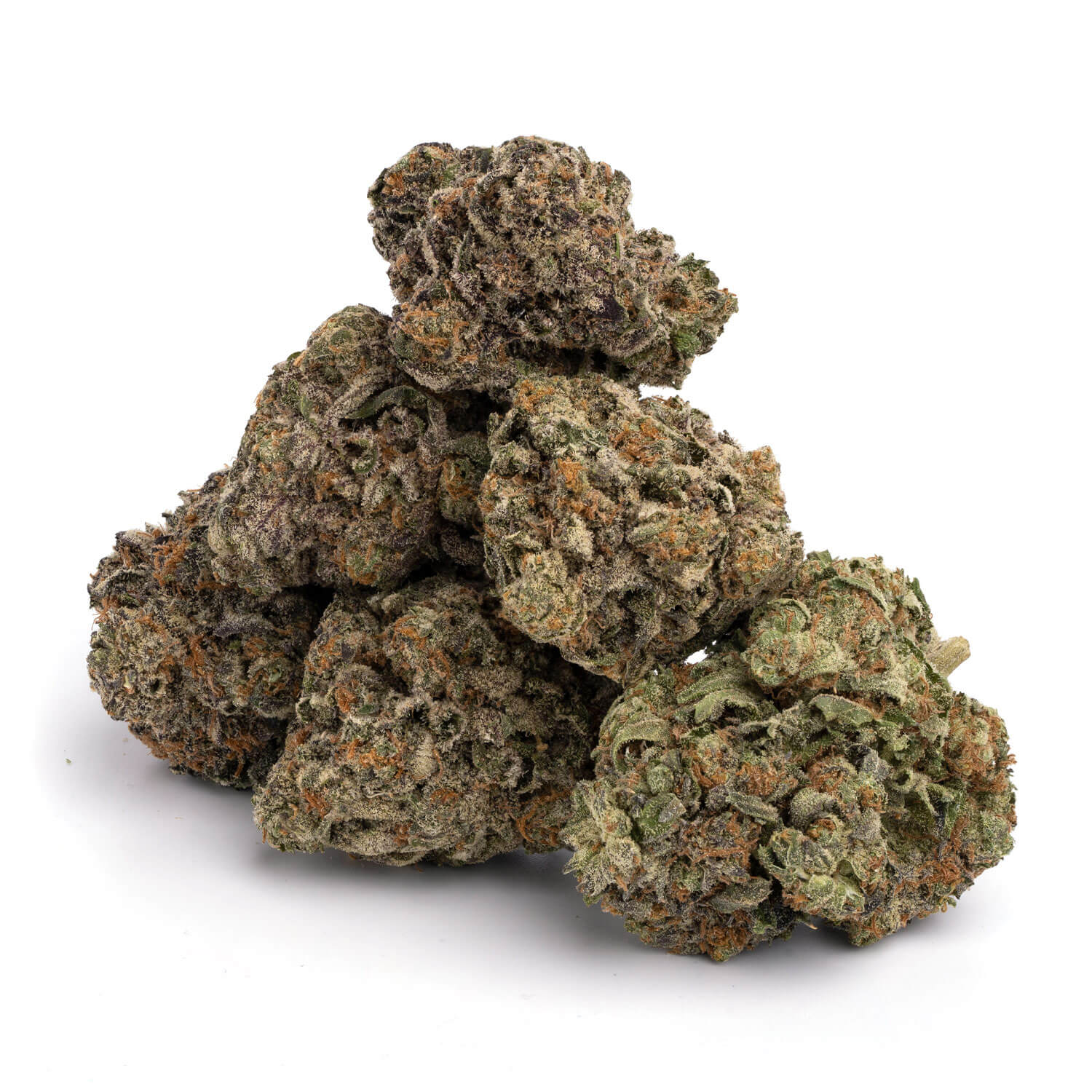 The buds are covered in trichomes, giving them a frosty appearance and a sticky texture to the touch. As well as, having orange hairs, which contrast nicely with the deep purple color of the buds.