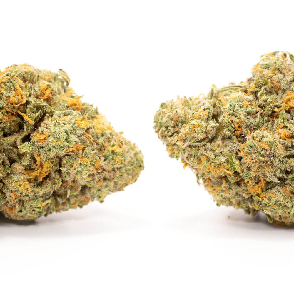 Quantum Kush has medium-sized dense and olive green in colour grape-shaped nugs. You can also notice fiery orange hairs poking through the nug. Besides, a thick layer of trichomes coats the nug delivering a white, frosty look.