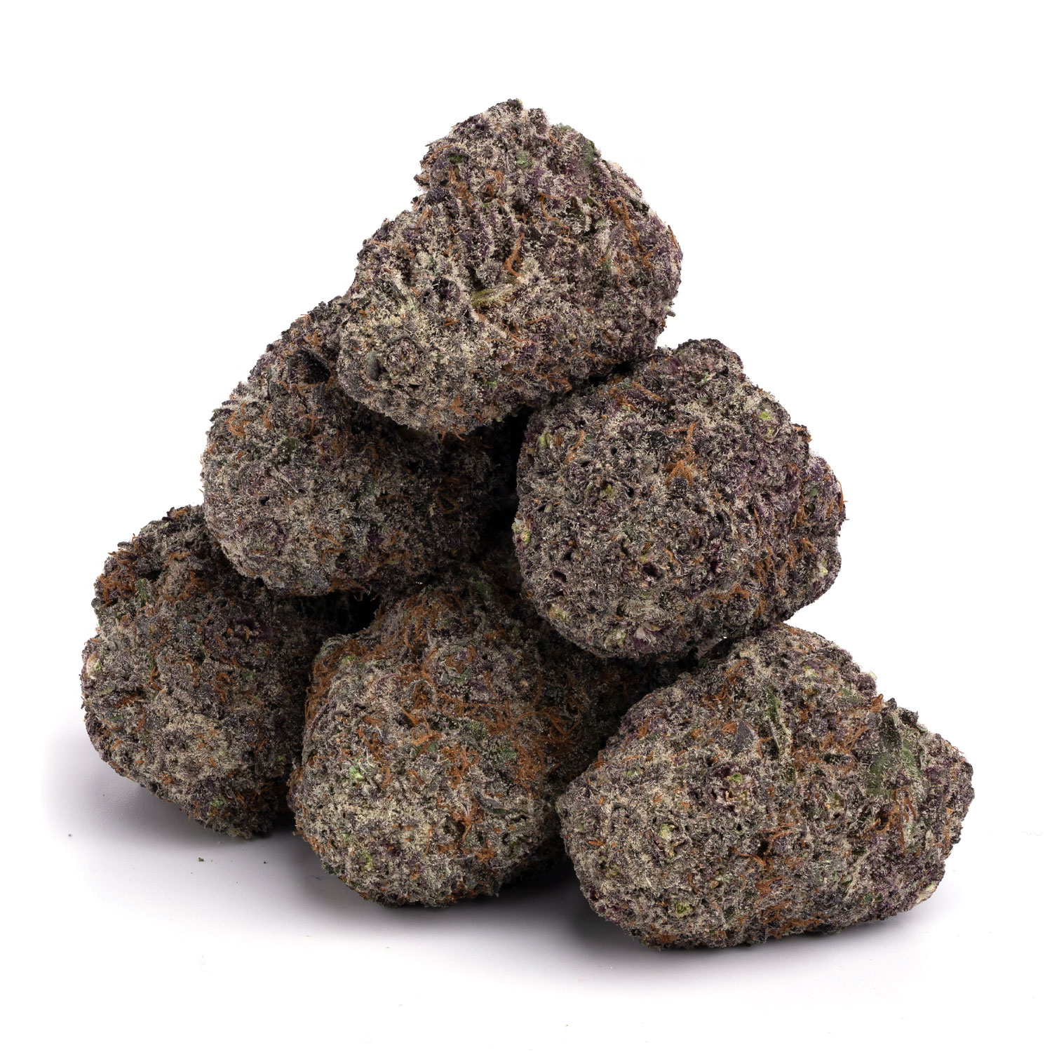 The buds are oversized and rounded, showcasing a lush forest green color with flashes of deep purple woven throughout. Light amber pistils stand out against a layer of frosty white trichomes, giving it a sticky, crystal-covered finish that screams quality.