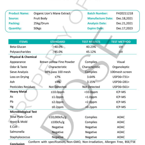- Optimal extraction of mushroom Beta-Glucan ≥ 40%, Polysaccharides ≥ 45% @ 7:1 Ratio Concentrate
