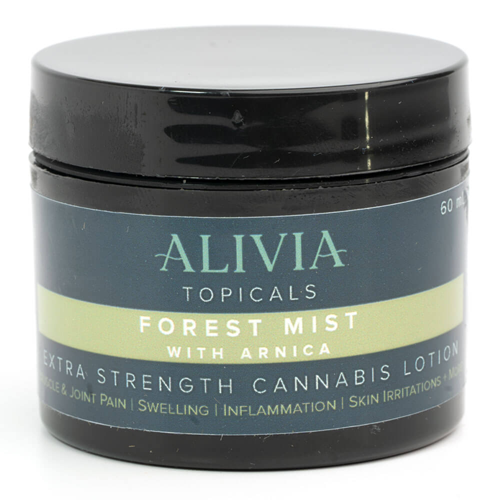 Forest Mist Arnica Lotion by Alivia Topicals is a gentle, non-greasy lotion infused with a 2:1 THC to CBD ratio. This lotion is enhanced with Arnica and Pine essential oils to specifically target sore muscles and inflammation. Try Forest Mist to reduce swelling and bruising from a sprained ankle to chronic pain from arthritis or carpal tunnel syndrome.