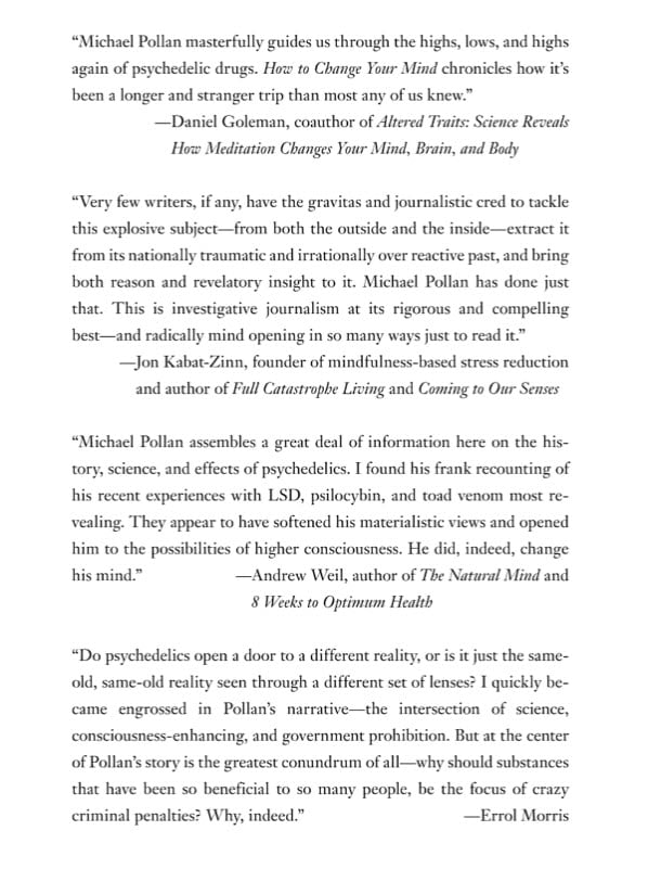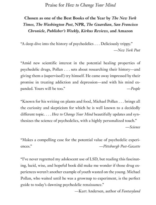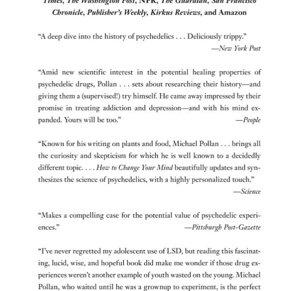 “Sweeping and often thrilling….It is to Pollan’s credit that, while he ranks among the best of science writers, he’s willing, when necessary, to abandon that genre’s fixation on materialist explanation as the only path to understanding. One of the book’s important messages is that the therapeutic benefits of psychedelics, for the dying or seriously ill, can’t be separated from the mystical experiences to which they give rise.”—The Guardian