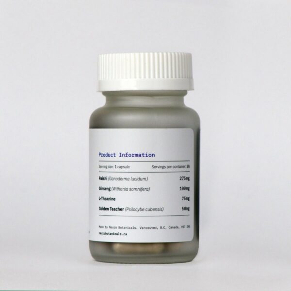 Ingredients: Golden Teacher (Psilocybe cubensis), Reishi (Ganoderma lucidum), Ginseng (Withania somnifera), and L-Theanine